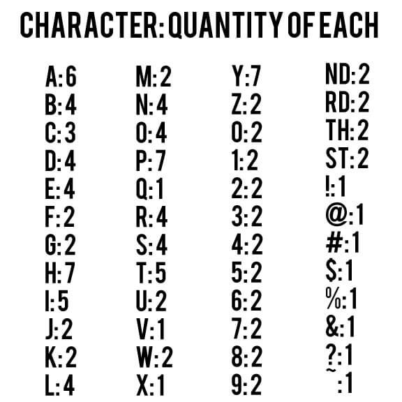 SYMBOLS (Symbols : Quantity) - !: 1, @: 1, #: 1, $: 1, %: 1, &: 1, ?: 1, ~: 1