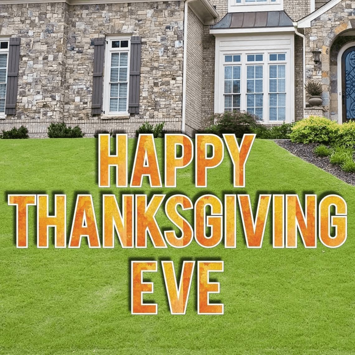 - OUTDOOR Thanksgiving Decor SIGN: This set comes with 21 letters that spell out 'Happy Thanksgiving Eve' . The letters are 18 inches high. Our yard cards are made to be used over and over again, year after year! Made from weatherproof and recyclable corrugated plastic.