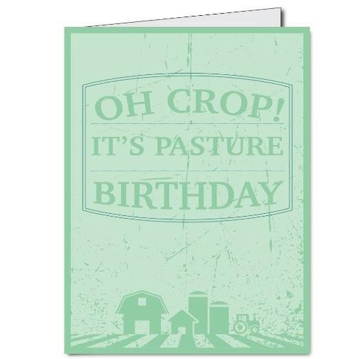 • Front of card reads "Oh Crop it's Pasture Birthday".