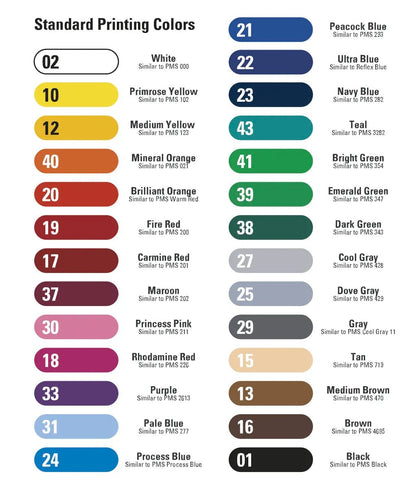 One to Two Color Screen printing - standard colors shown
