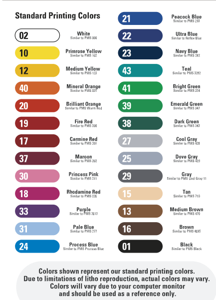 - Nonstandard ink colors incur an additional fee of $58.00 per color. Standard ink colors are shown.