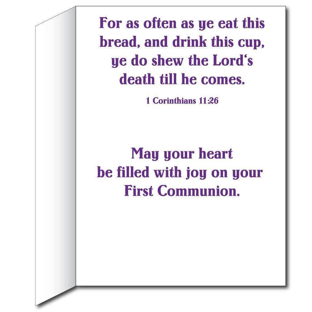 • Inside reads: “'For as often as he eat this bread, and drink this cup, ye do shew the Lord's death till he comes. 1 Corinthians 11:26. May your heart be filled with joy on your First Communion”