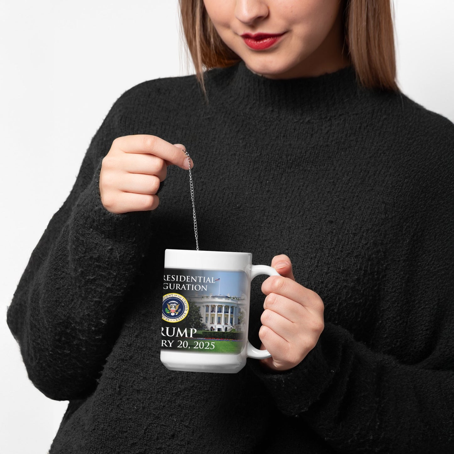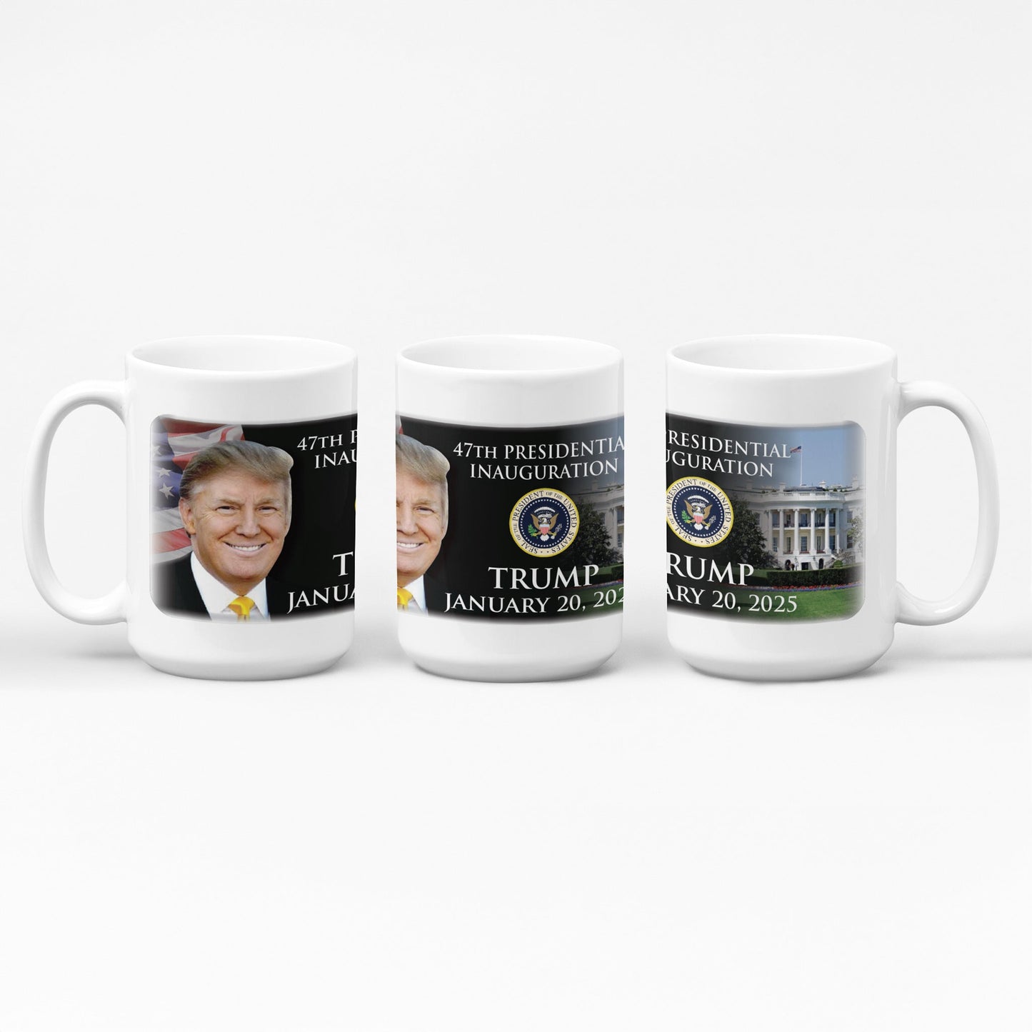 Celebrate History: Honor the 47th Presidential Inauguration with this unique 15-ounce ceramic coffee mug, featuring Donald Trump’s smiling portrait, the Presidential seal, and a White House backdrop. This collectible mug proudly commemorates Trump’s inauguration on January 20, 2025.