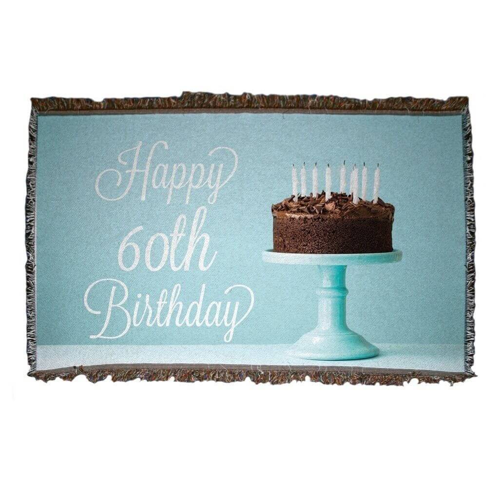 - Happy 60th Birthday woven blanket comes with a design on one side and brown woven fabric on the other.