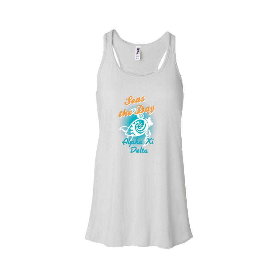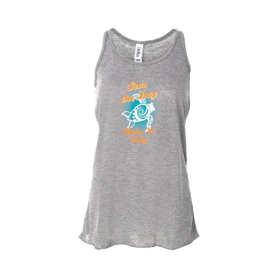 Brand new Alpha Xi Delta Seas the Day Turtle design on a comfy, flowy tank in heather gray or white. Design printed on the front and relaxed back.