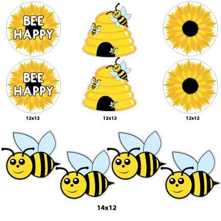 - ITEM SPECIFICS: Each Bee Happy Honey Bee set is printed in full digital color on one side of outdoor grade corrugated plastic. Each Bee Happy round sign measures approximately 12" Round, each Bee Hive measures 12" x 12", each Sunflower measures 12" Round, and each Bee measures 14"x12". The set includes short stakes for easy displaying. All Bee Happy Honey Bee designs are a flat design, not 3D and comes with 2 Bee Happy signs, 2 Bee Hive signs, 2 Sunflower signs and 4 Bee signs. Use these Bee Happy Honey Bee signs to line your driveway or sidewalk, or add to another Yard Greeting! Durable and long lasting decorations and Easy to use and reuse.