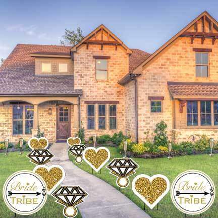- This set comes with 2 Bride Tribe signs 23.5"x23.5", 5 gold hearts 6"x15", 4 rings 21"x18" and 6 champaign glasses 6"x20". This set is lightweight for an easy setup.
