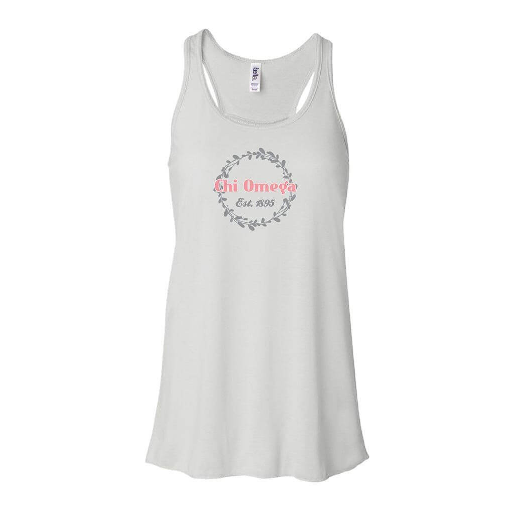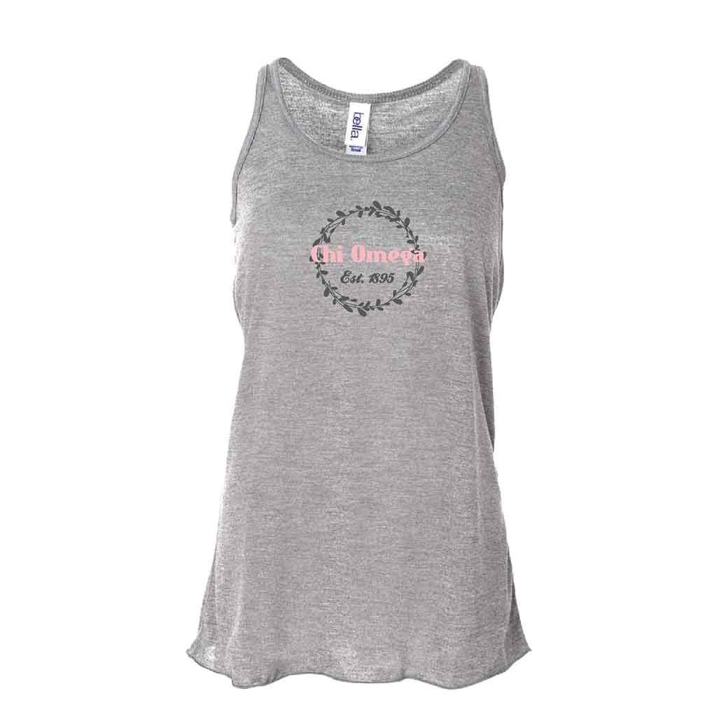 Brand new Chi Omega retro, laurel wreath design on a comfy, flowy tank in heather gray or white. Design printed on the front and relaxed back.