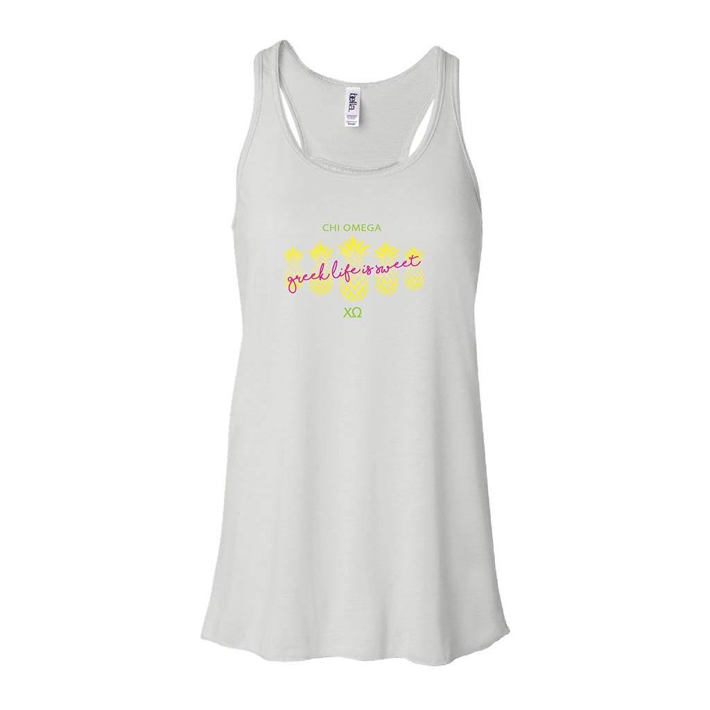 Chi Omega pineapple design on a comfy, flowy white tank. Chi Omega Greek Life is Sweet design printed on the front and blank, relaxed back.