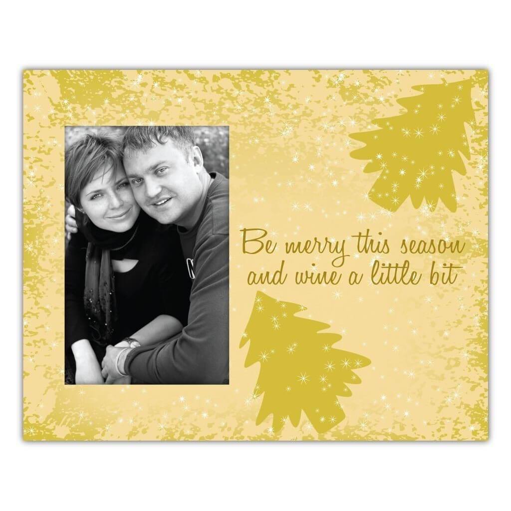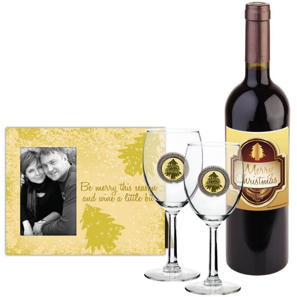 Product Description: Christmas wine gift set comes complete with photo frame, two wine glasses, and wine bottle label (bottle of wine not included). Picture frame printed with full color digital graphic and reads "Be merry this season and wine a little bit". Picture frame, measures 8"x 10" overall and holds a 4x6 picture. Fits a picture with a vertical orientation. 5/8" MDF (Medium Density Fiberboard) thick, with a flat black edge, smooth glossy surface. The front glass and rear easel are included, along with 2 keyholes for hanging. Two 10 oz pewter accented wine glasses included with 0.94" round graphic that says Merry Christmas. Wine Bottle Label measures 4"x5" and you can stick on any bottle of your favorite Vino! This wine gift set will make the perfect gift for your sweetheart this holiday season.