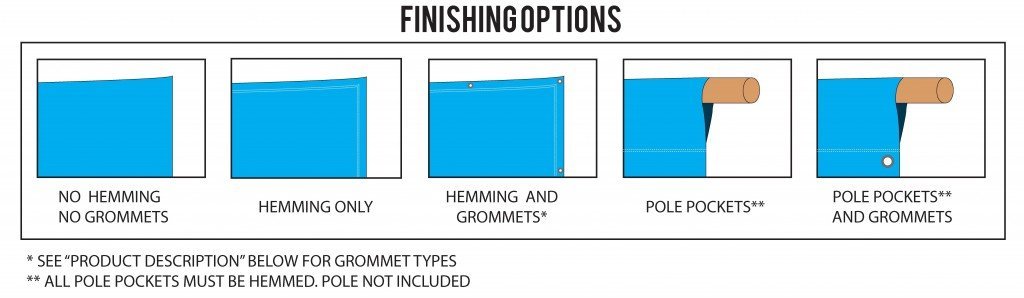 - Finishing: Taped hems with grommets every two feet for easy hanging