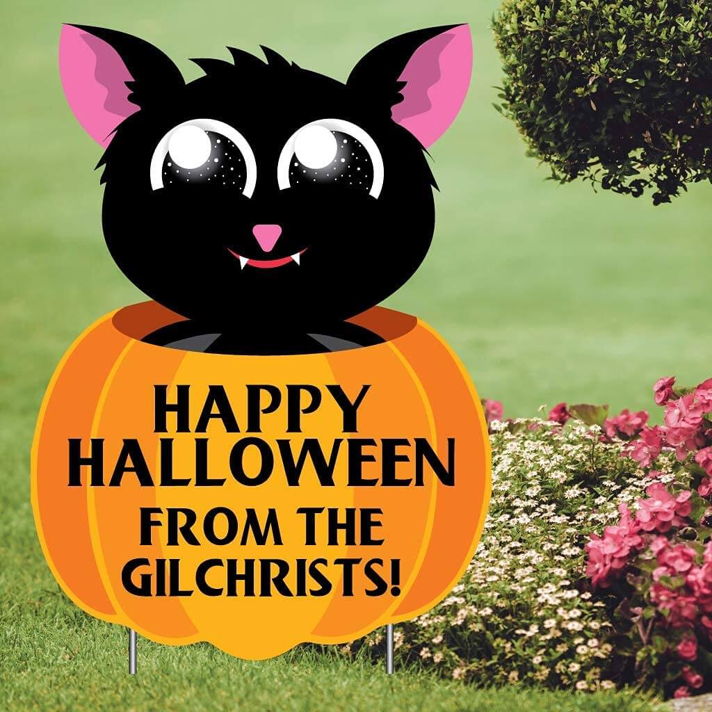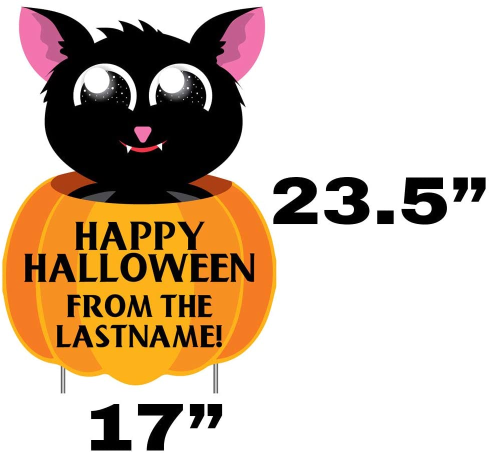- OUTDOOR SIGN: This cute bat in a pumpkin Yard Sign Decorations measures 17"x23.5" customized with your last name name. Each Halloween Decoration is printed in full digital color on outdoor waterproof corrugated plastic, digital color on outdoor waterproof corrugated plastic. Each shapes cut from corrugated plastic, not cardboard!