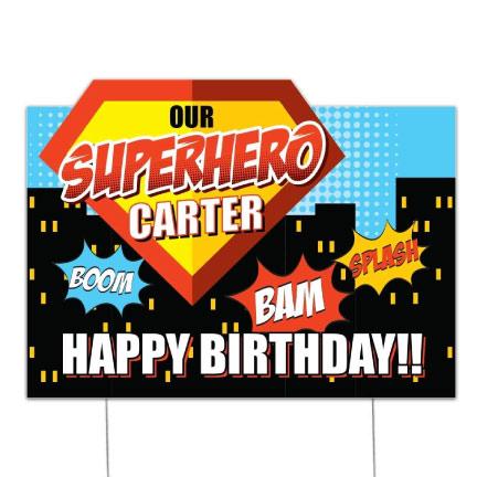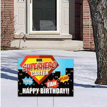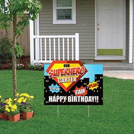 - BIRTHDAY YARD SIGN: CUSTOM SUPERHERO BIRTHDAY PARTY SUPPLIES Wish that special someone a joy-filled Birthday. Think how surprised they will be with any of our yard sign outdoor decorations.