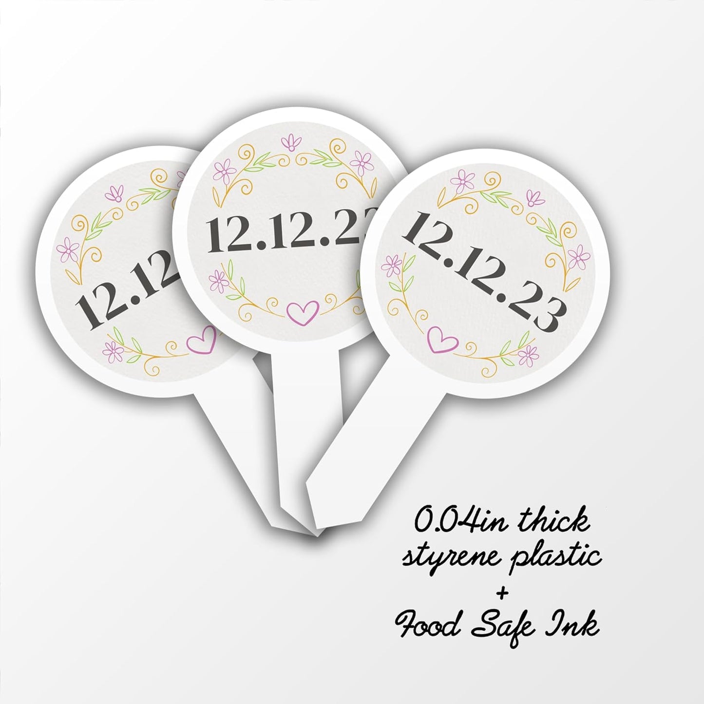 These toppers are perfect for your event decorations. Crafted from 0.04 inch styrene plastic and printed with food-safe ink, they are both safe and visually appealing.