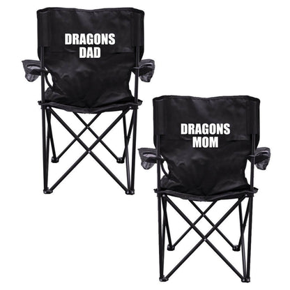 This black camping chair set is perfect for you next baseball game! The chair comes with a "Dragons Mom" and "Dragons dad" design on the outside back panel of the chairs.