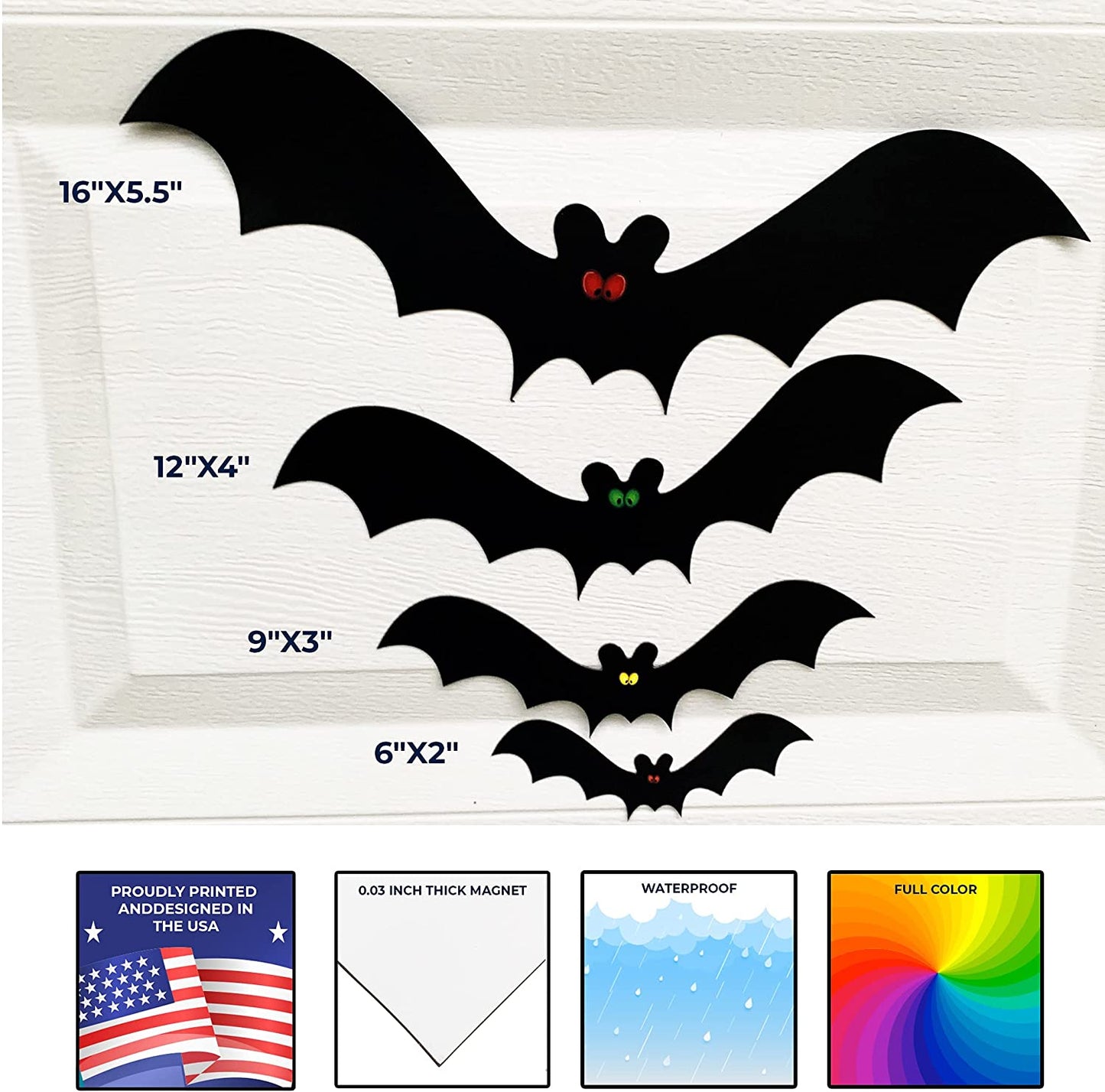 - MAGNETIC BATS - 16 bats with printed eyes; 4 of each size 16"x5.5", 12"x4", 9"x3" and 6"x2".