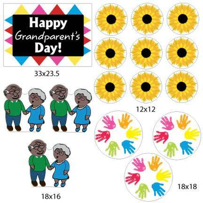 - You will receive 1 "Happy Grandparent's day" 33"x23.5" greeting sign, 3 grandparents measuring 18"x16", 3 hand print circles measuring 18"x18"and 9 sunflowers measuring 12"x12".