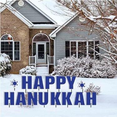 - OUTDOOR SIGN: Happy Hanukkah Letters Yard Card. Our Happy Hanukkah letters yard display comes with 13 letters to spell out Happy Hanukkah, and 2 stars. Each letter is 18" tall and includes 2 stars that are 11" x 13". These outdoor decorations are printed digitally in full color. This set comes with 2 stake per letter for an easy set up. Our yard cards are made with weatherproof and recyclable corrugated plastic for long lasting use.