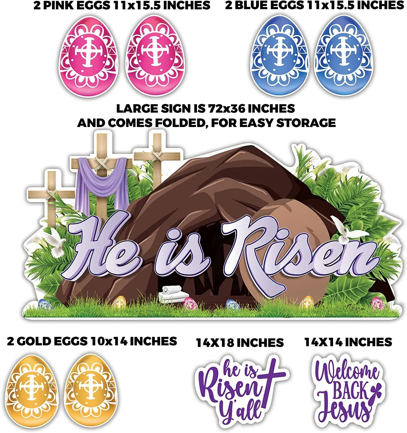 - Includes a jumbo 72x36 Inch yard sign featuring Jesus' tomb and "He Is Risen" text in eye-catching Easter colors.