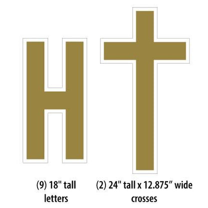 • This decor set includes 9 - 18" tall letters that spell out HE IS RISEN, and 2 - 24" tall crosses, printed in gold ink.
