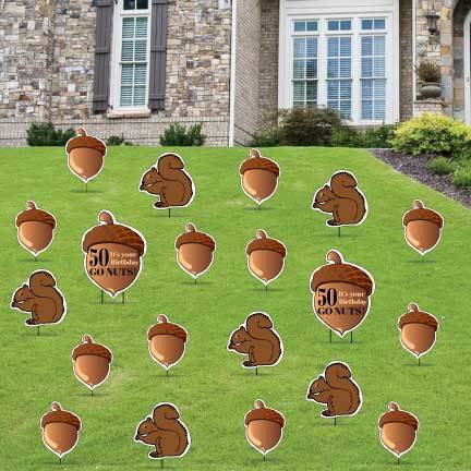 - Celebrate someone special with out Outdoor Lawn Decorations: Its Your Birthday Go Nuts! features 6 squirrels 15"x15", 12 acorns 11"x15" and 2 large acorns 17"x23.5".