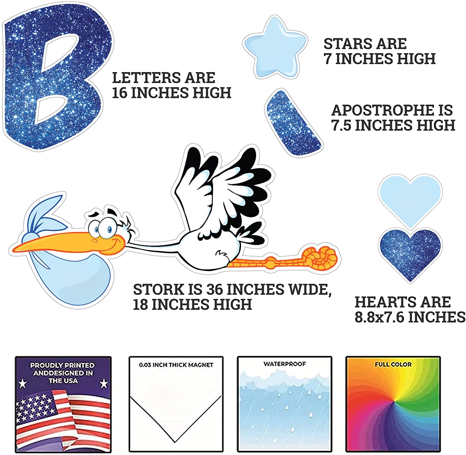 - 15 Piece set include 7 letters 16" high, 2 stars 7" High, 4 Hearts 7.6" high, 1 stork 36" wide.