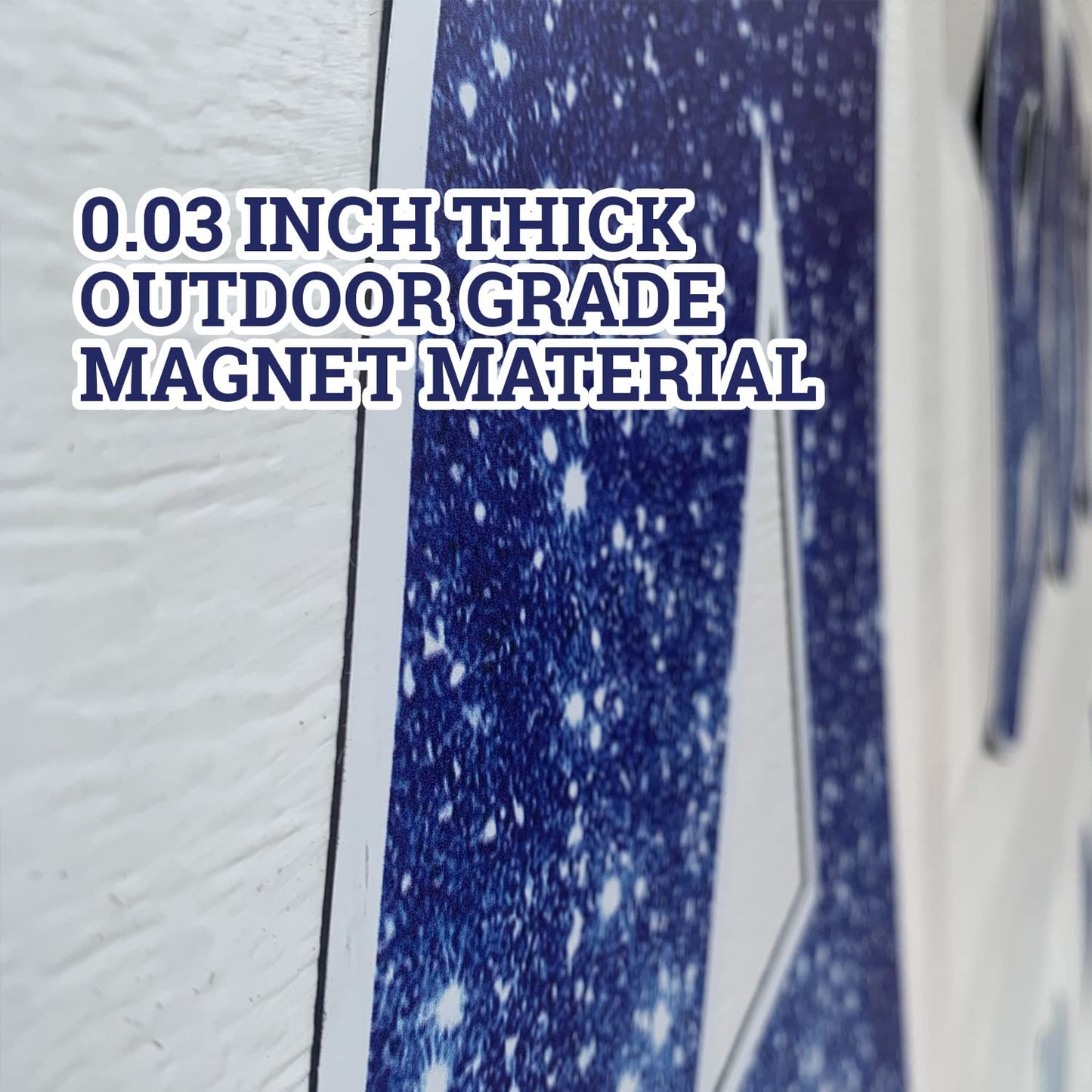 - Outdoor grade magnet material is 0.03 inches thick, has a strong magnetic hold and is waterproof