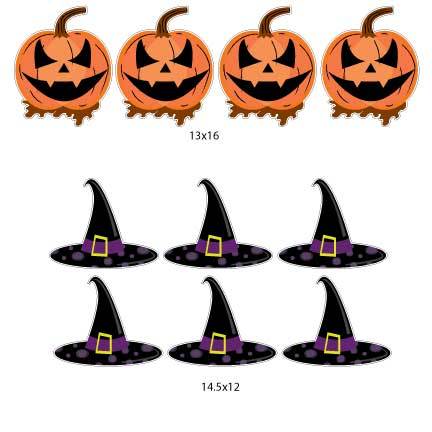 This collection of 4 Jack O'Laterns 13"X16" and 6 witch hats 14.5"x12" includes 2 short stakes for each shape. Each shapes cut from corrugated plastic, not cardboard! Each cut out measures approximately 6.5"x8.25".
