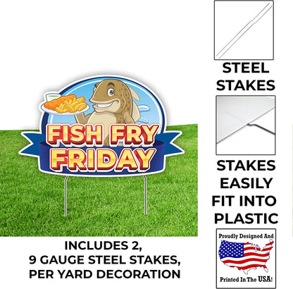 You'll be frying up a storm with our Jumbo Fish Fry Friday Yard Cards. With 13 pieces, metal stakes, and UV-safe ink printing, you'll be serving up a successful promotion - with a side of sizzling style! Plus, they're waterproof and long-lasting so you'll be fishing for customers all year long. And they pair swimmingly with our Fish Fry directional yard signs: Directional Yard Signs Here