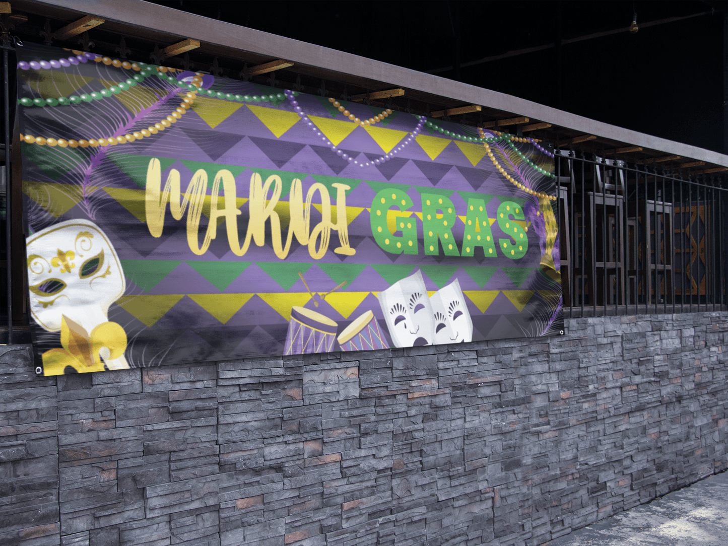 - Check out our great MARDI GRAS banner to use in public places like the office, store, school, shopping mall etc. Waterproof surface and will last longer without the printing becoming faded.