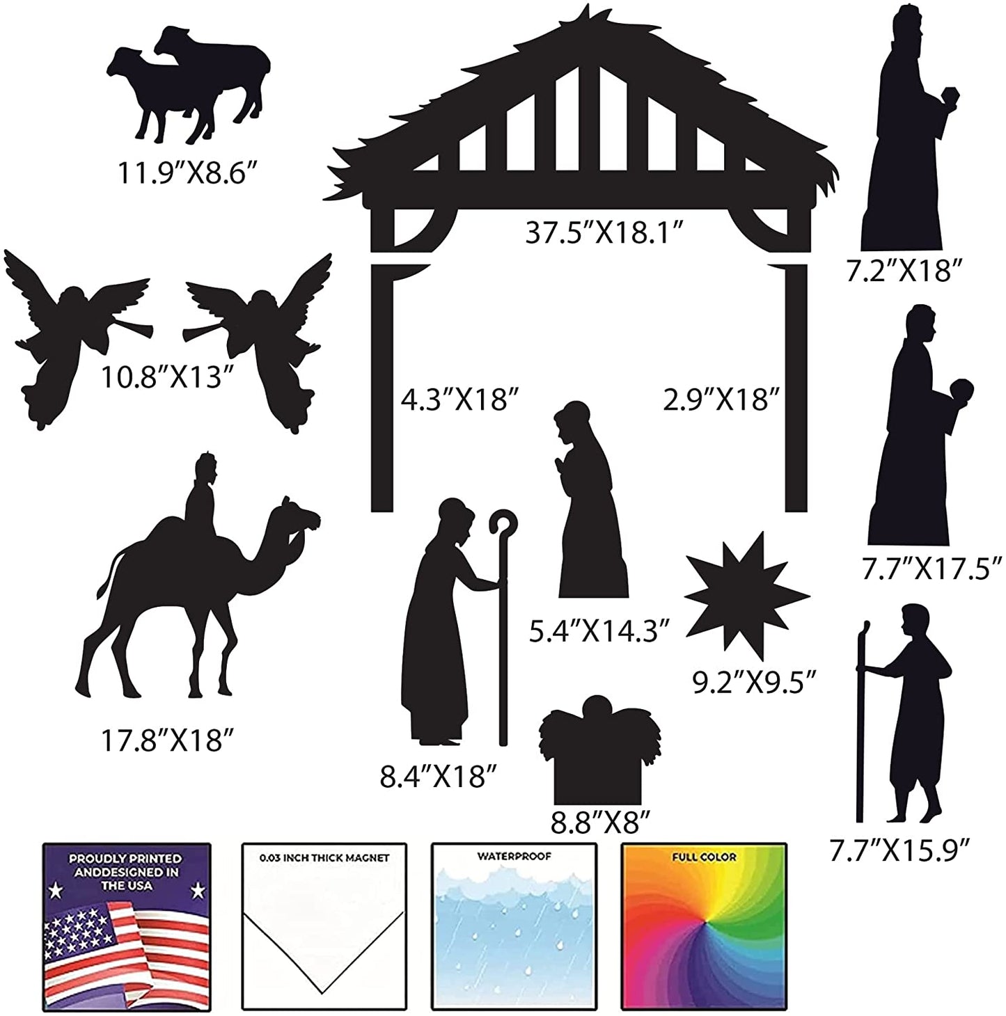 - Large Nativity Display: Includes 15 magnets, with the roof and manger poles measuring 34"W x 33"H.