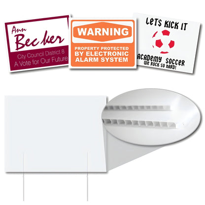 | Top Uses | Makes use of a four-color printing technique using environmentally friendly UV ink that is resistant to weather elements. Ideal for both indoor and outdoor use, it serves as versatile directional signage, property markers, political campaign displays, birth announcements, real estate listings, event promotions, yard sales signs, and business advertisements, making it a perfect choice for diverse communication needs. |