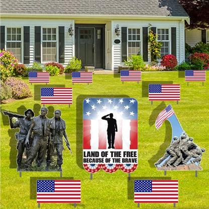 - The set includes 8 flags that measure 8.8"x17", a Vietnam memorial measuring 32"x30", an Iwo Jima memorial measuring 23"x30", and a sign with text measuring