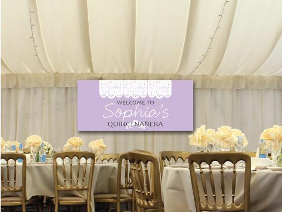 Celebrate in style with this traditional paper cutout design Quinceañera Banner. Design features a traditional Papel Picado look design to honor a special young girl's 15th birthday celebration. Customize with her name and color.