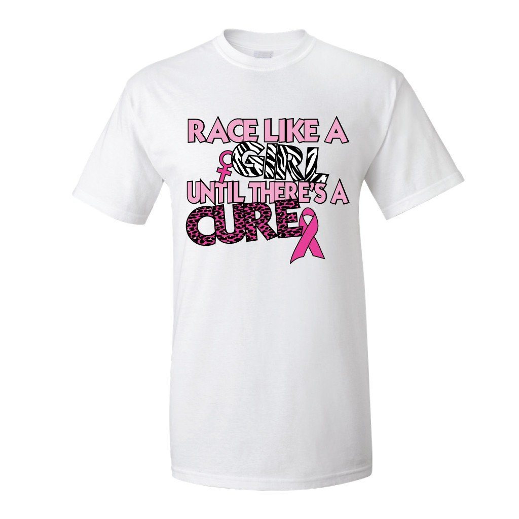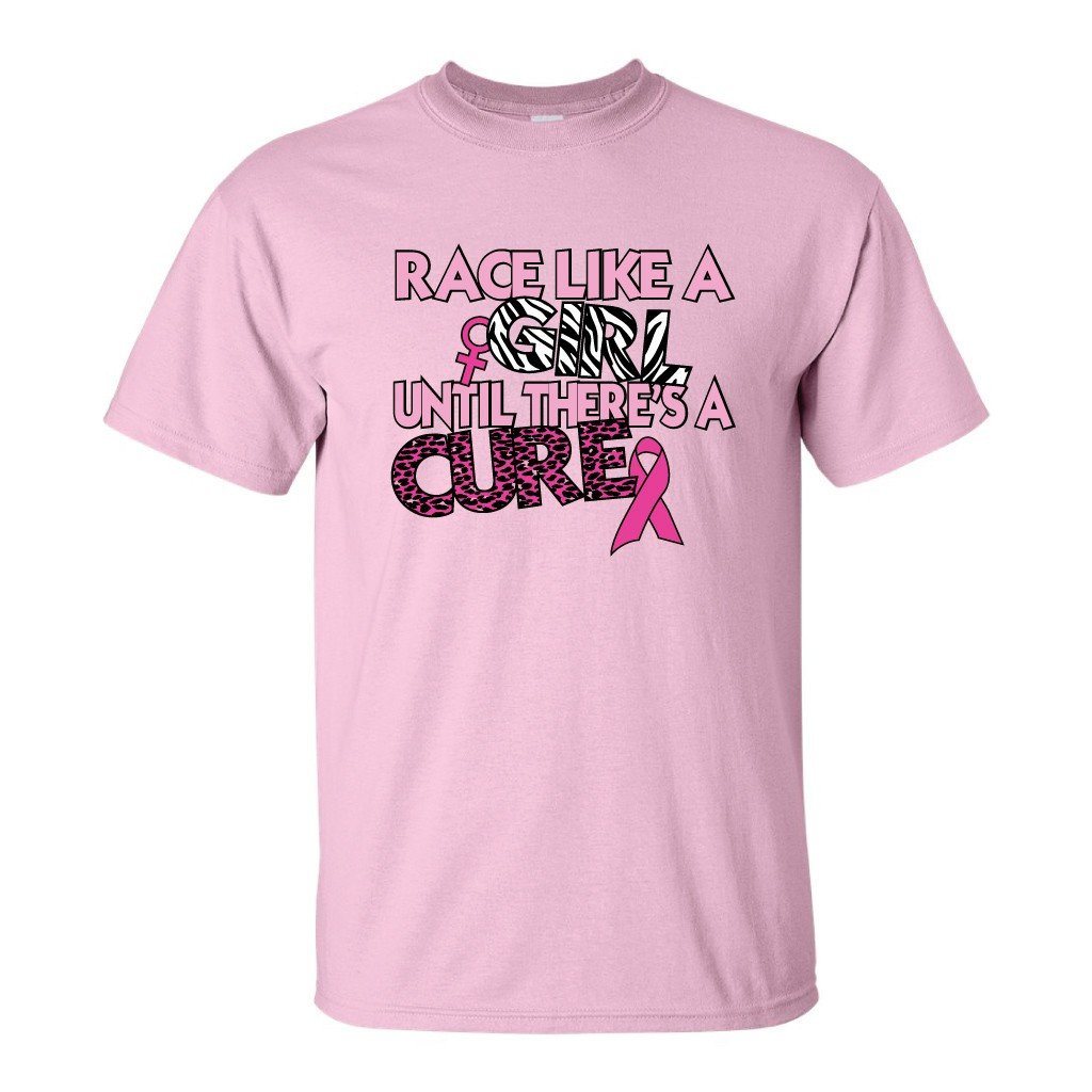 Show your support of Breast Cancer Awareness with this great 'Race like a Girl, Until There's a Cure' T-Shirt. This T-Shirt is 6oz. pre-shrunk 100% cotton. This T-Shirt is a UniSex sized T-Shirt and stays pretty true to size.