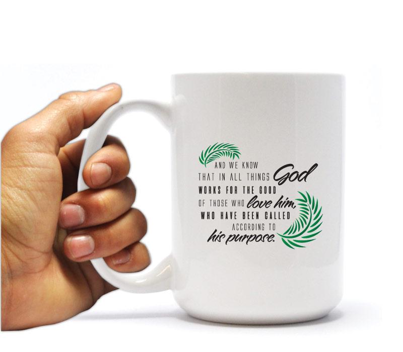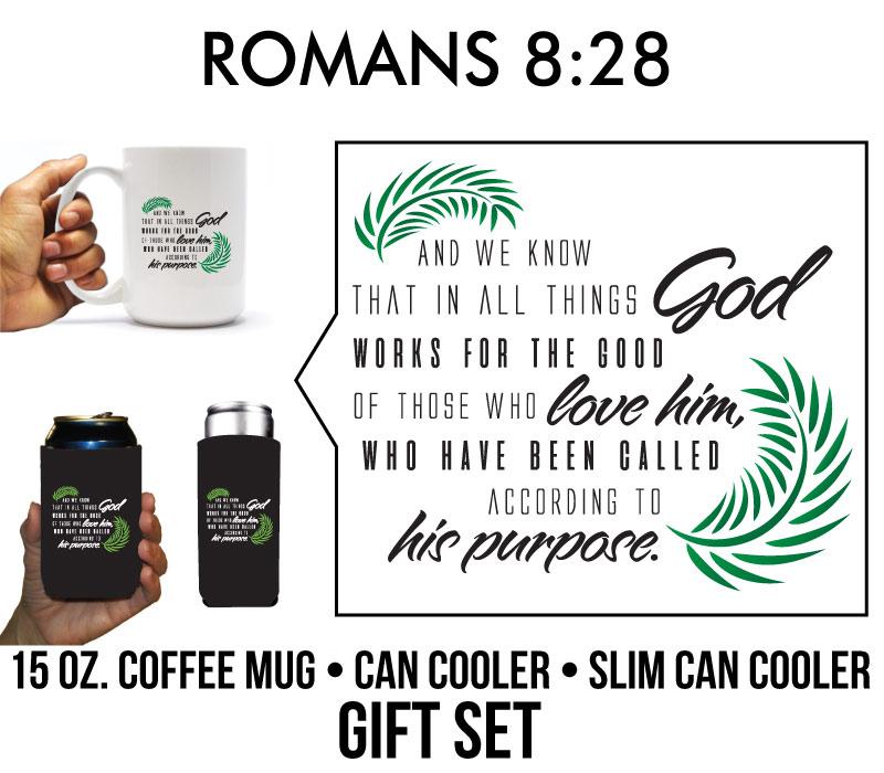 Romans 8:28 Religious Coffee Mug & Can Cooler Gift Set