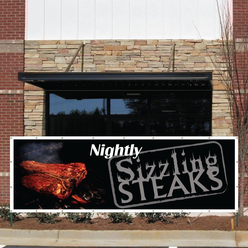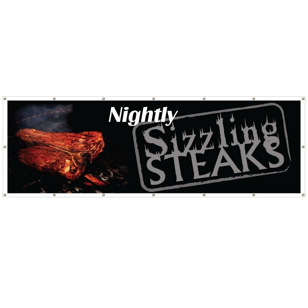 • 'Sizzling Steaks Nightly' banner on your choice of 13 oz vinyl banner material or 15 oz heavy duty banner material
