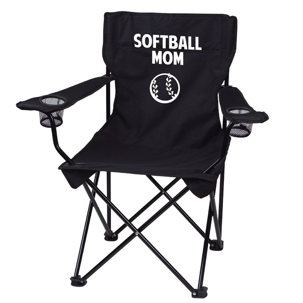 This black camping chair is perfect for you next softball game! The chair comes with a "Softball Mom" design on the outside back panel.