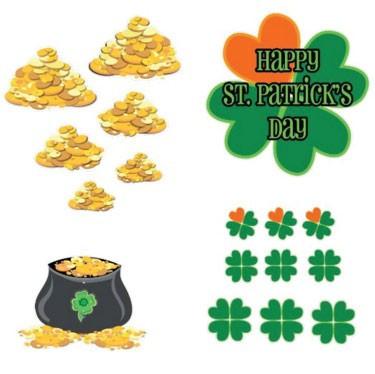 The largest piece is the "Happy St. Patrick's Day" shamrock and measures approximately 31.5" x 31.5", pot o"gold measures approx. 18.5" x 24.9", large piles of gold measure approx. 12.6" x 18.1", medium piles of gold measure approx. 9.2" x 13.8", small piles of gold measure approx. 6.1" x 9.3", large shamrocks measure approx. 8.7" x 8.7", medium shamrocks and shamrocks with orange leaf measure approx. 6.5" x 6.5".