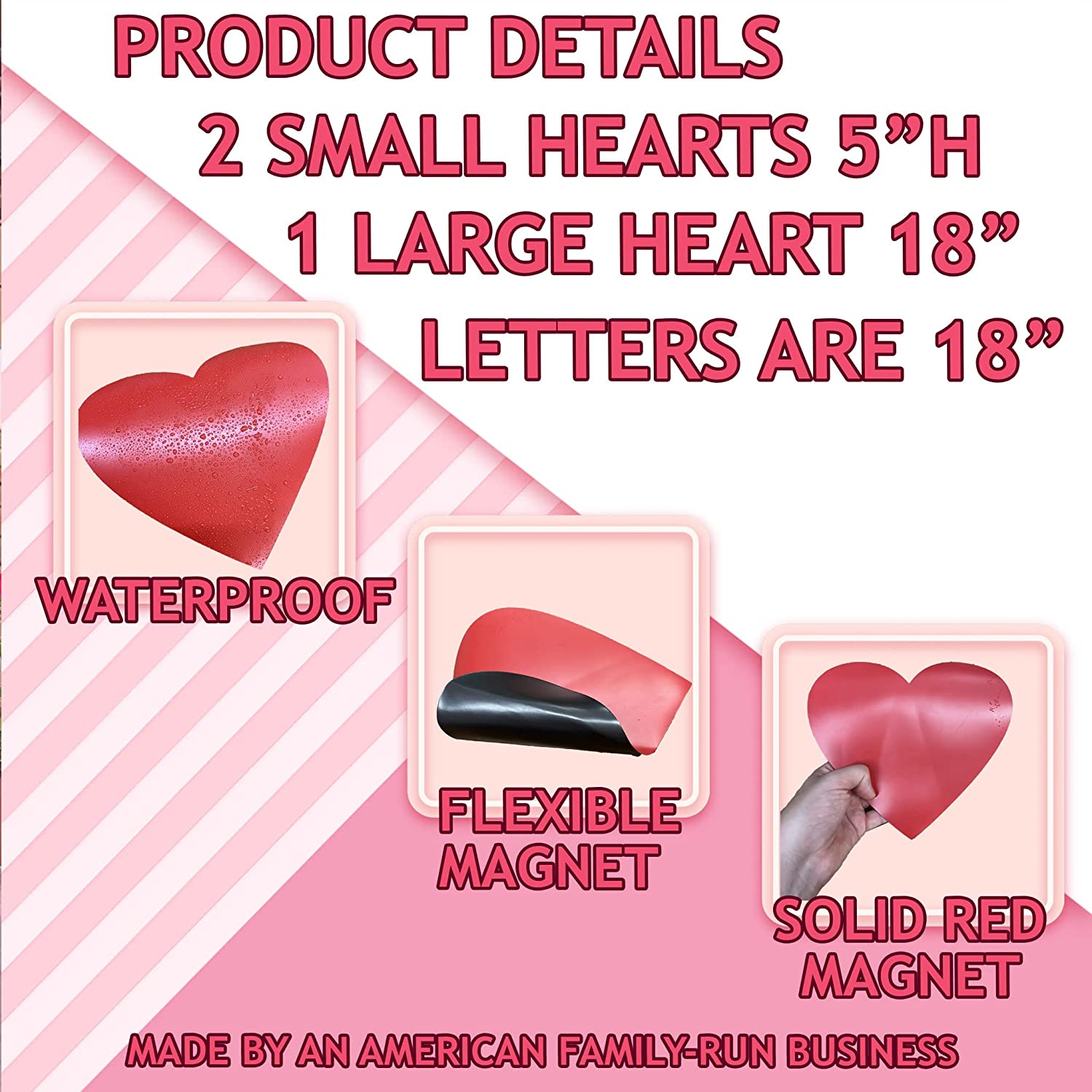 - Jumbo Heart magnets have 18" letters, 1 18" heart, and 2 5" hearts
