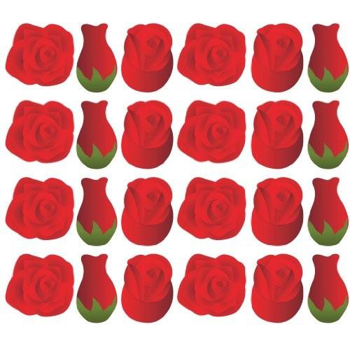Set includes 8 full roses that measure 8"x7", 8 rose buds that measure 4"x8", and 8 partially opened roses that measure 6"x8".