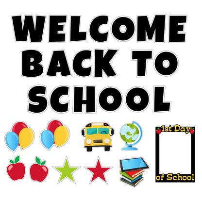 • This set includes 29 pieces total: 19 letters that spell our 'WELCOME BACK TO SCHOOL' and 10 corresponding signs that include apples, balloon clusters, stars, globe, stack of books, school bus, and the photo selfie frame.