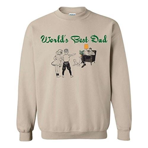 World's Best Dad crew neck sweatshirt features a 50s-60s theme. It shows the father in his chair with a baby by his feet while his other son and daughter stand from a distance pointing at him.